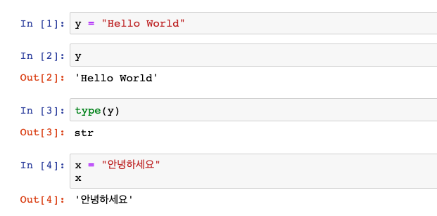 - 파이썬에서 문자열은, 싱글퀏(작은따옴표 ' ) 이나 더블퀏 (큰따옴표 " ) 로 양 끝을 감싸줘야 한다.