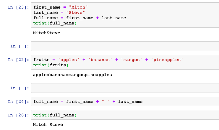 - 더하기 연산자를 이용해서 문자열을 붙일 때, 공백을 포함시켜서 결합시키려면, " " 공백 문자열을 중간에 넣어주면 된다.