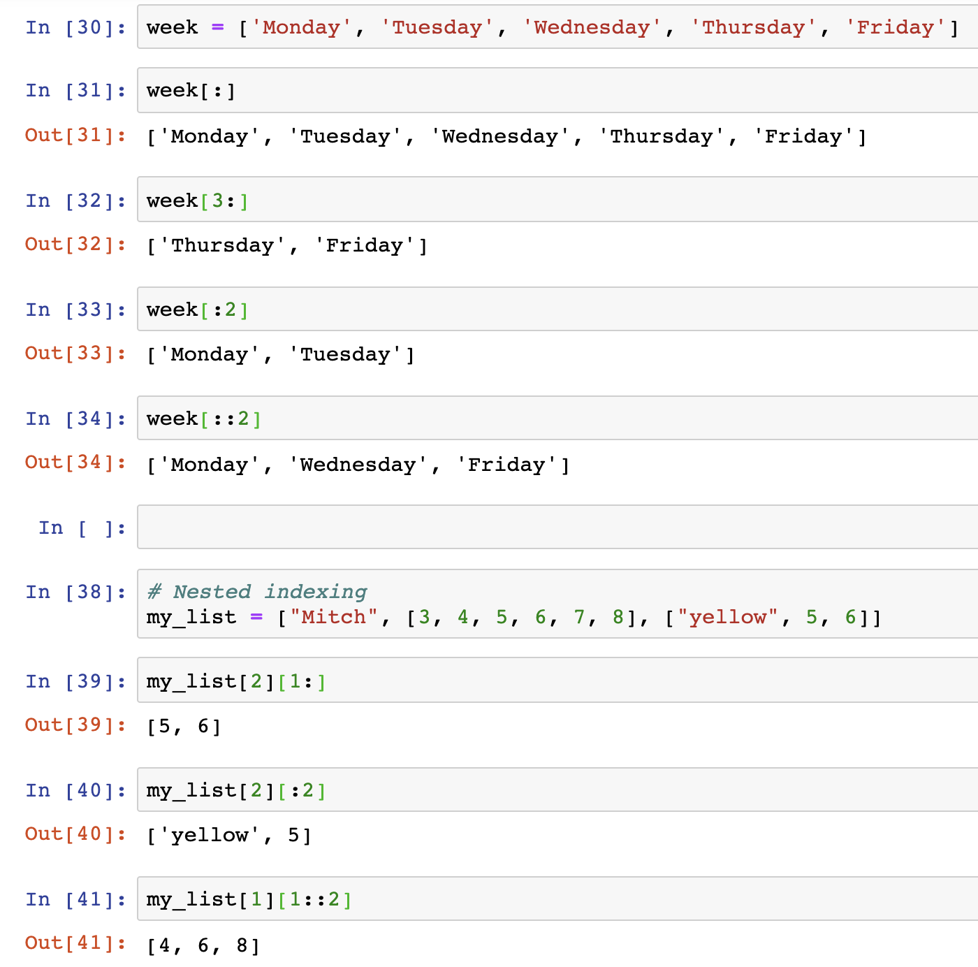 슬라이싱(추출) 문법은 다음과 같다. Nested List 예제도 포함.