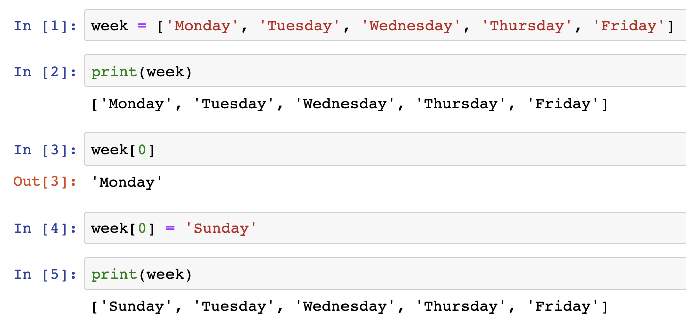 따라서 week[0] 에 Sunday 를 저장하겠다고 하여, week[0] = 'Sunday' 라고 써주면 된다.