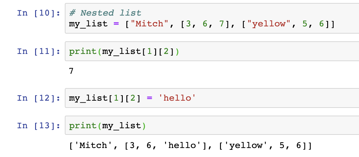 따라서 my_list[1][2] = 'hello' 라고 써주면, " = " 기호의 오른쪽에 있는 hello 라는 값을, 7의 자리에 저장하게 된다.