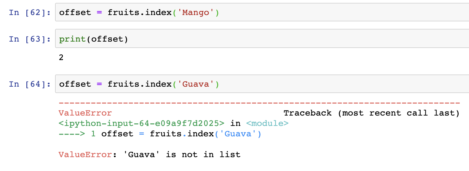 따라서 fruits.index('Mango') 를 해주면, 인덱스는 0부터 시작하므로, Mango 인덱스 위치값인 2 가 리턴된다.
