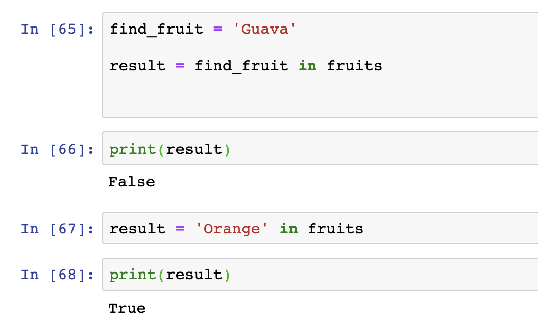 결과는 True 또는 False 가 리턴되며, True 이면 리스트에 해당 값이 존재하는 것이고, 존재하지 않으면 False 가 리턴된다.
