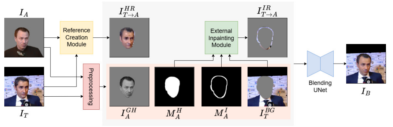 - Blender: 생성된 머리를 대상 이미지와 자연스럽게 합성하여 피부색을 맞추고 불일치 영역을 채움