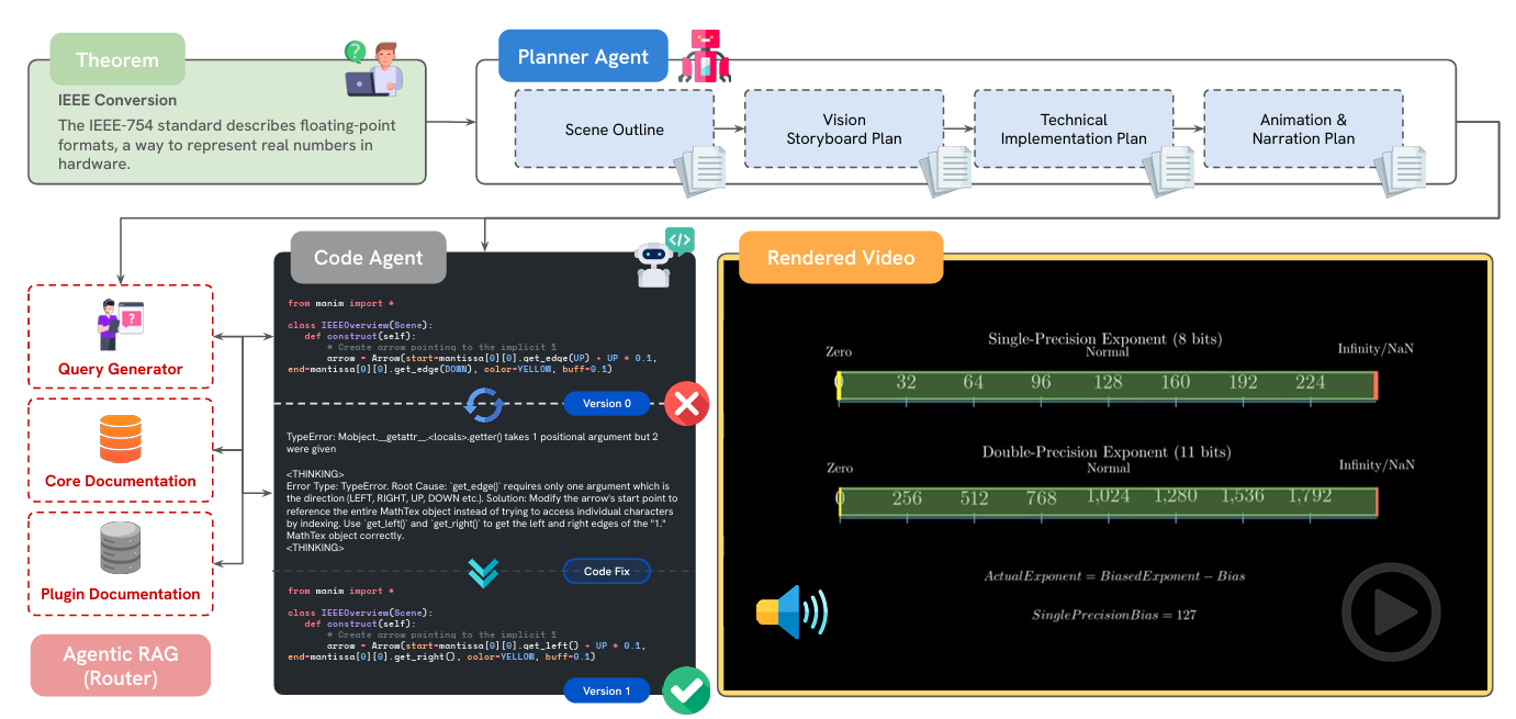 - Code Agent: Python Manim 라이브러리를 사용하여 애니메이션 코드 생성
