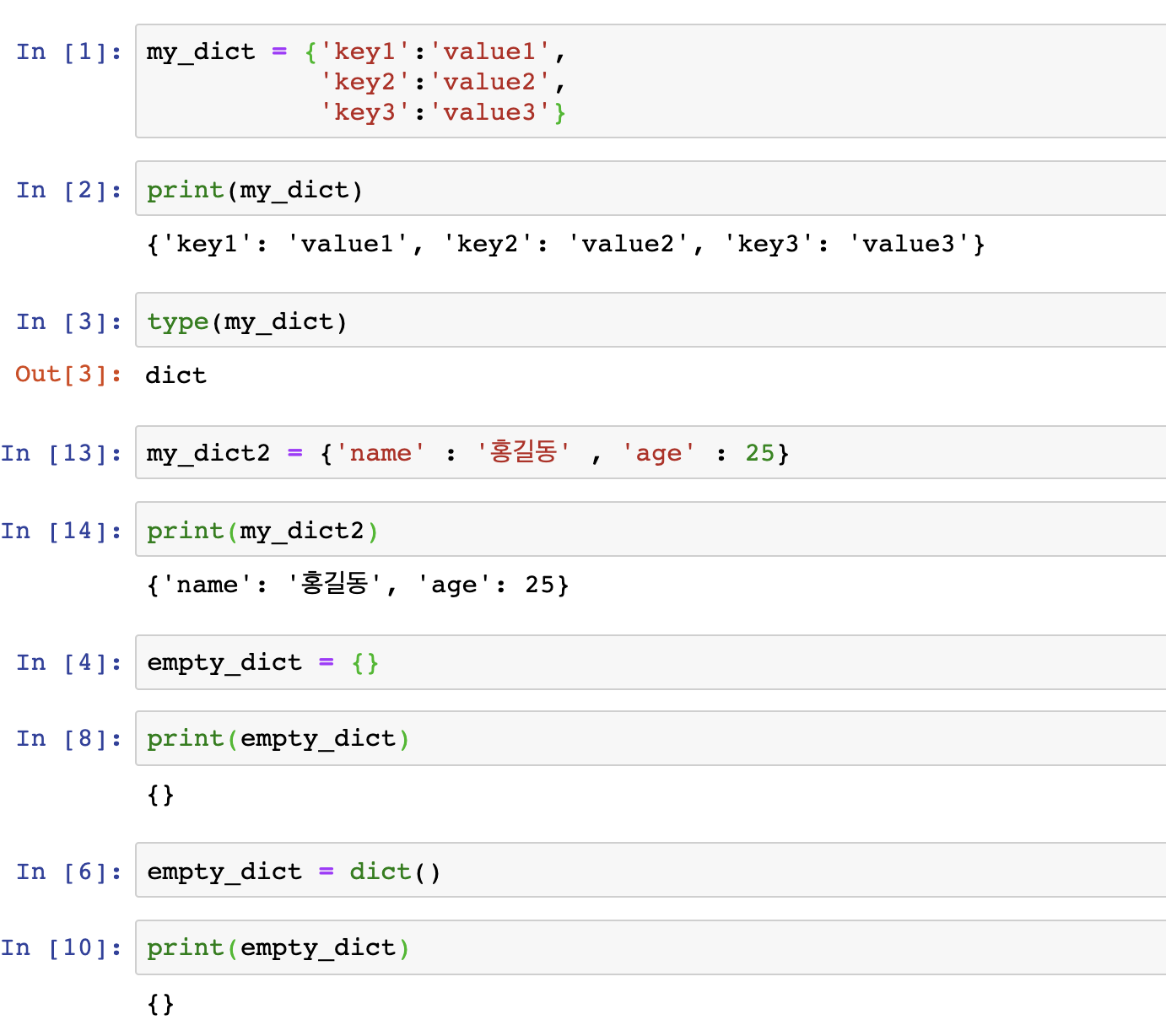 비어있는 딕셔너리(dict) 를 만드는 방법은 중괄호를 그냥 사용하거나, dict() 라고 사용하면 된다.
