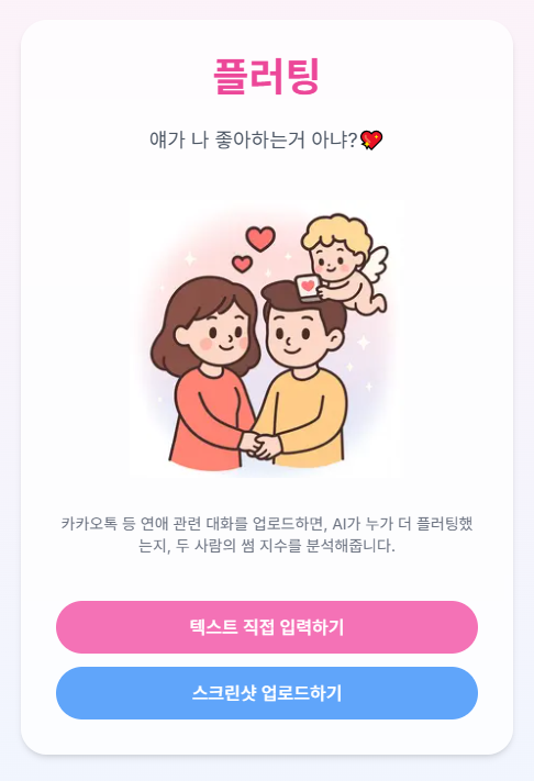 안녕하세요! 오늘은 연애 고민을 한 방에 해결해 줄 혁신적인 서비스, '플러팅'을 소개해 드리려고 해요. 상대방이 나에게 관심이 있는지, 우리 관계가 발전할 가능성이 얼마나 되는지 궁금하신가요? 카카오톡 대화만 있다면 AI가 모든 것을 분석해 드립니다!