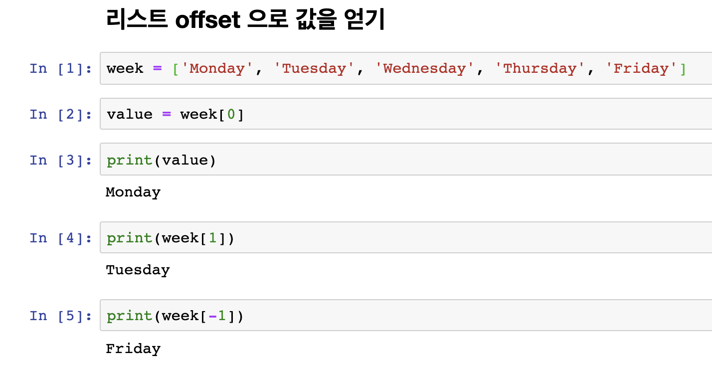 리스트에 저장된 값을 접근하여 가져오기 위해서는, 인덱스(오프셋 offset )을 알아야 한다.