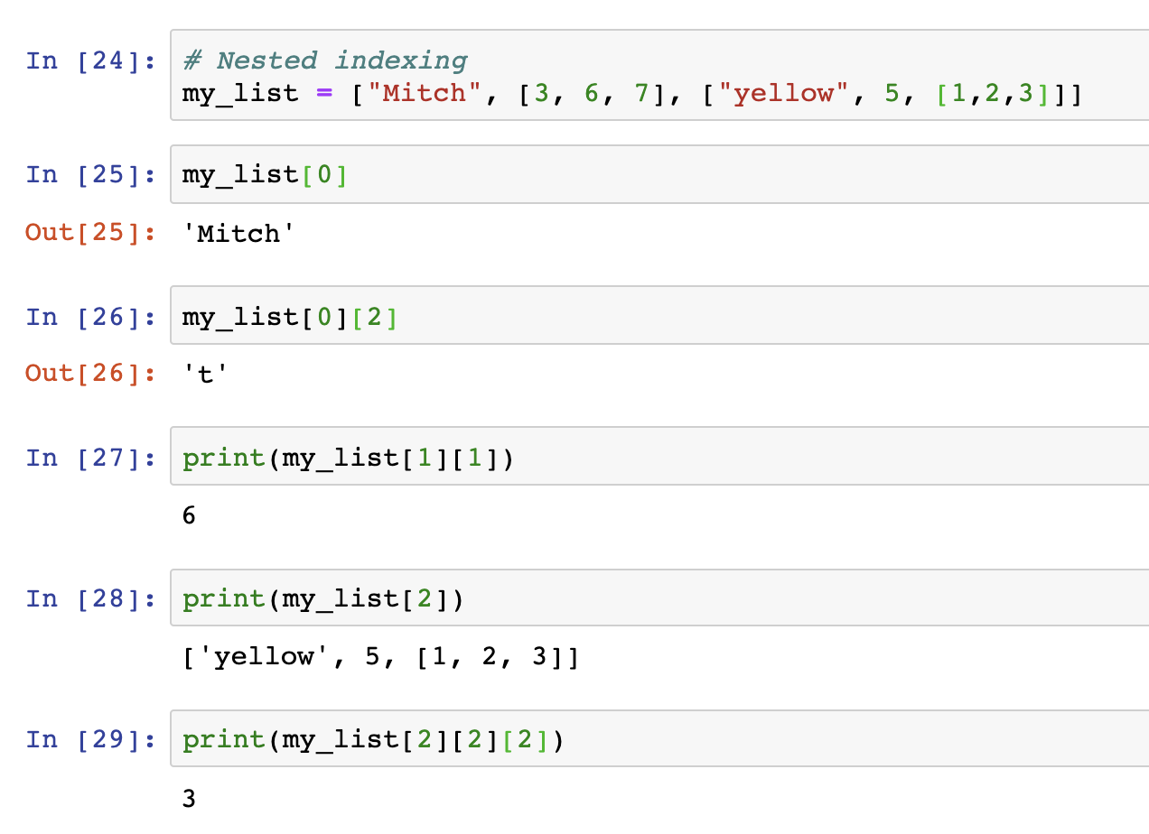 my_list[0] 인 'Mitch' 에서, 인덱스가 2인 t 를 찾으라는 얘기이다. ( M 은 0, i 는 1, t는 2 )