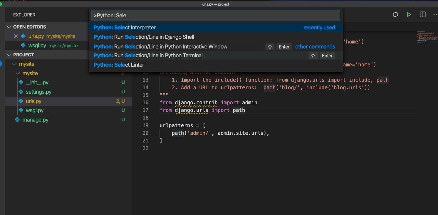 3. 입력창에, Python: Sele 정도 까지 입력하면, 자동으로 아래처럼 추천하는 명령들이 나온다. 여기에서 Python: Select Interpreter 를 선택한다.