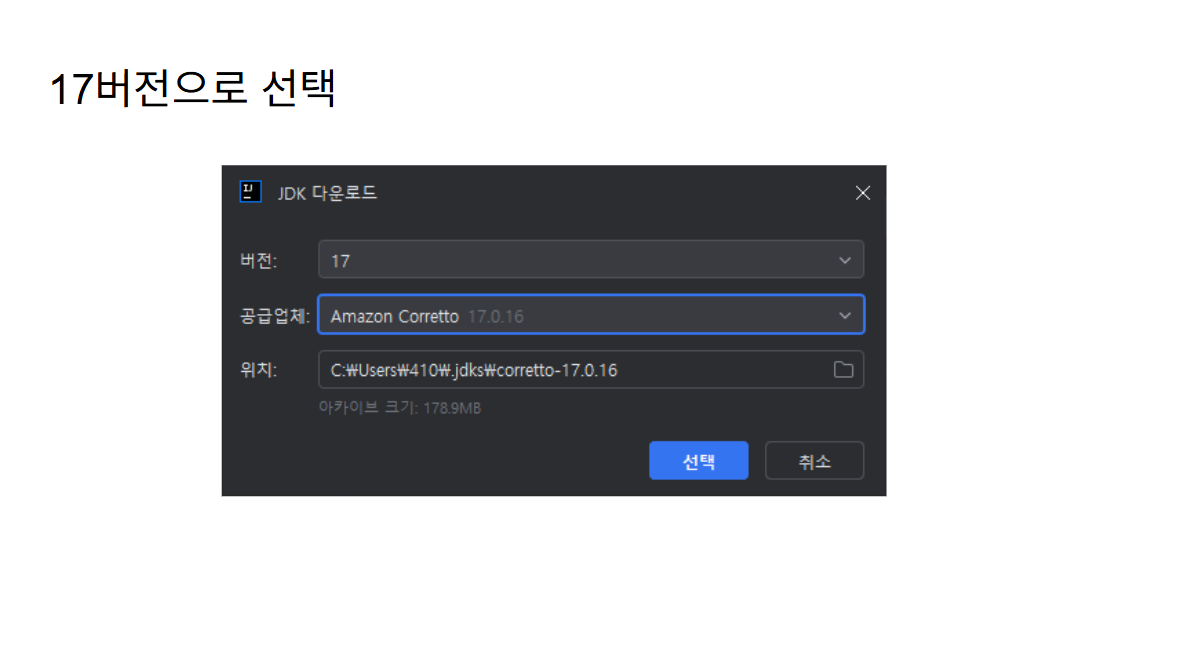 자바 버전은 17저번으로 하고, 공급엡체는 여러개가 있는데, 아마존의 코레토를 선택한다.