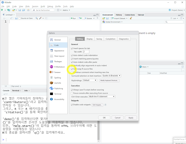 2. 코드 자동 줄바꿈 설정 : Code - Editing - Soft-wrap R source files 체크
