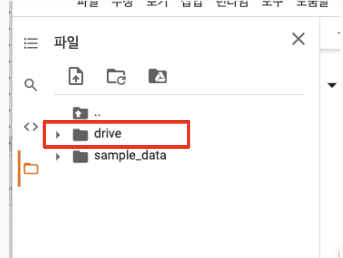 7. Colab 에서 왼쪽의 네모 아이콘 누르고, 드라이브 파일 보기