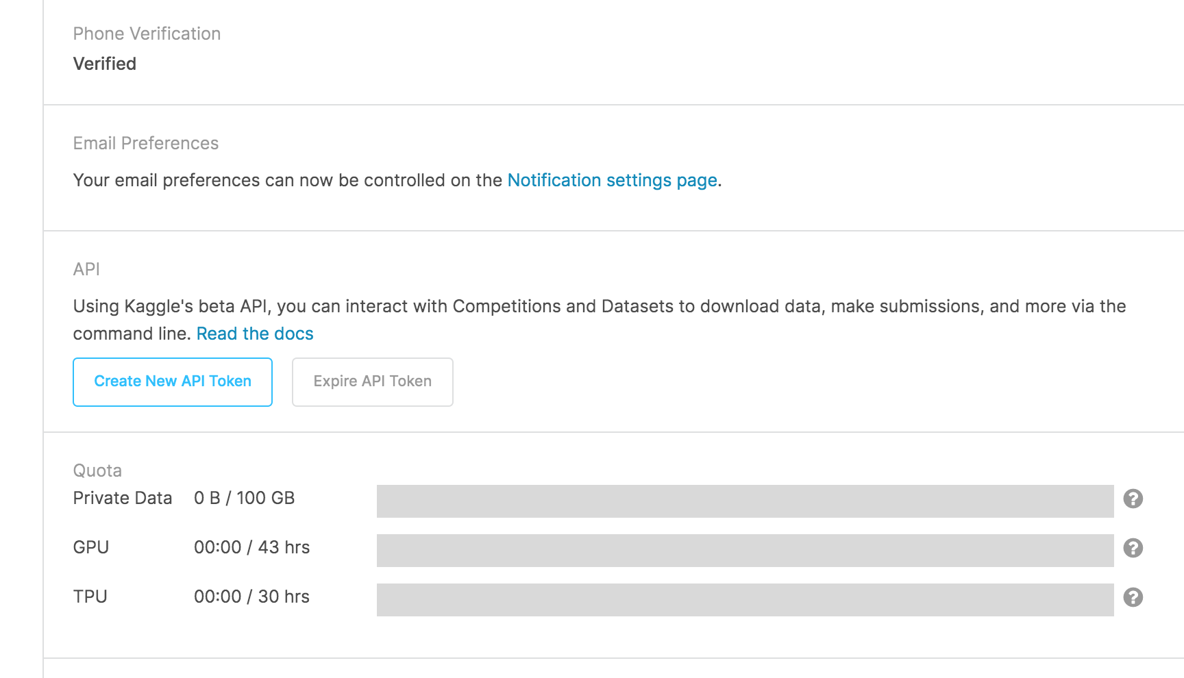 3. 중간 쯤에, API 항목이 있다. 여기서 Create New API Token 버튼을 눌러서, kaggle.json 파일을 다운로드 받는다.