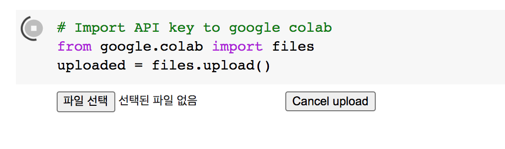 5. 위의 3번에서 다운로드 받은, kaggle.json 파일을 업로드 하기 위해, 아래처럼 실행한다.
