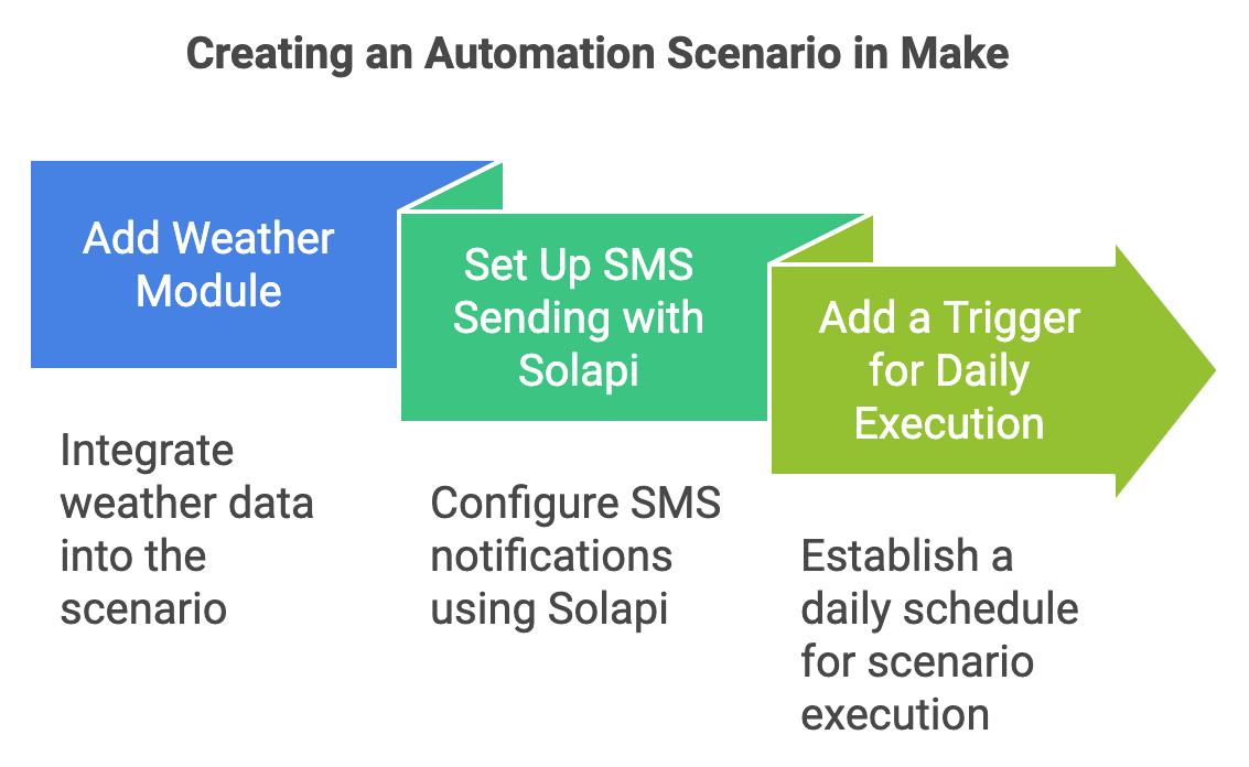 Make를 사용하면 날씨 정보 조회, 문자 전송, 설문 응답 처리 등 다양한 작업을 자동화할 수 있습니다.