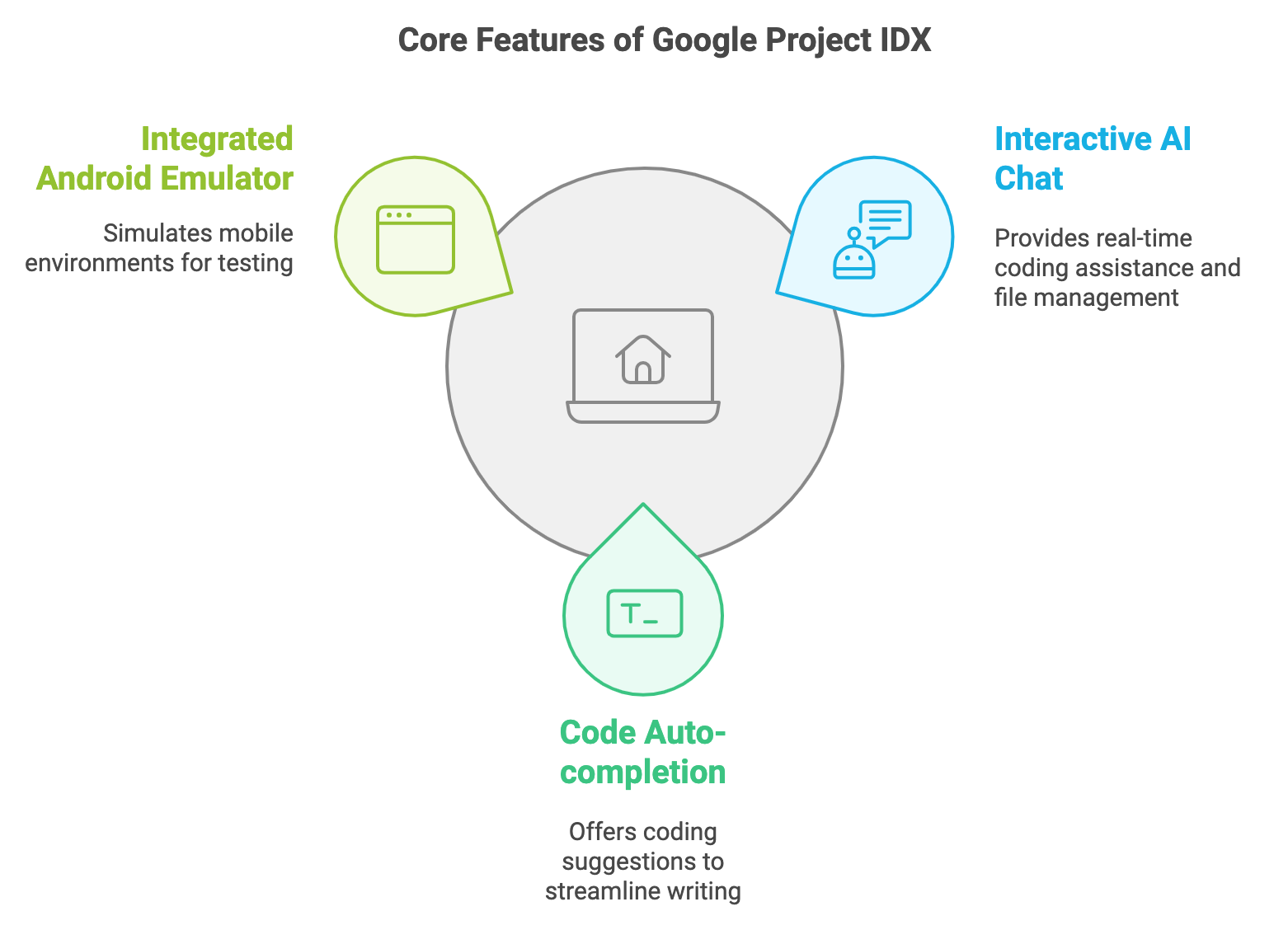 Project IDX는 Google이 개발한 무료 AI 코드 편집 도구로, 다음과 같은 기능을 제공합니다: