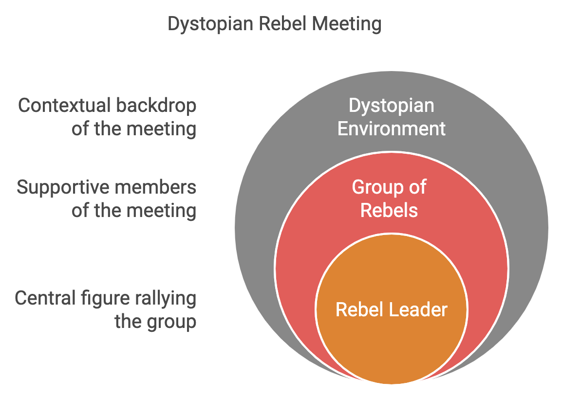 - 주인공과 동료들이 비밀 회의에서 저항 계획을 세우는 장면.