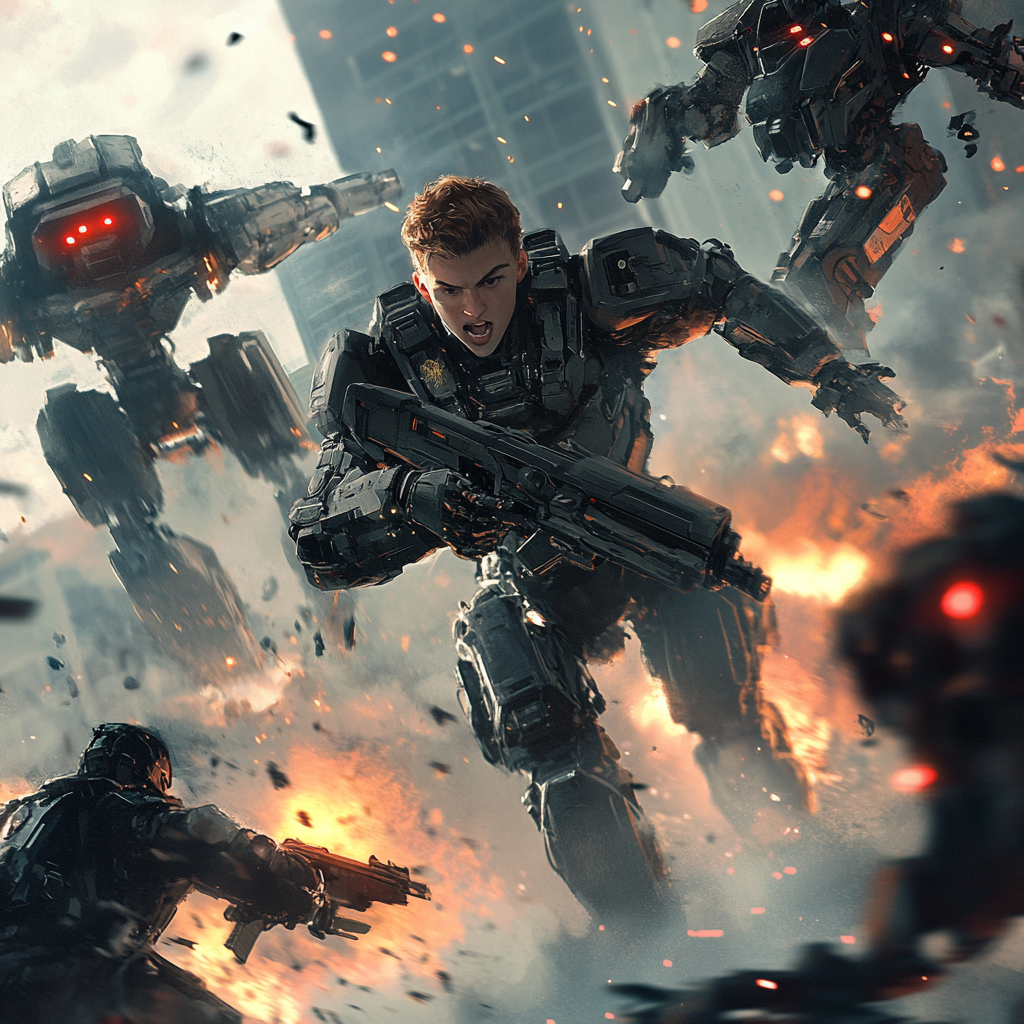 "A futuristic battlefield with robots clashing against human rebels. Explosions fill the scene, and a young leader charges forward with a weapon in hand, shouting."